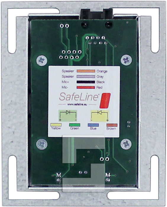 SafeLine 3000 -puheyksikkö, asennus käyttöpaneelin taakse (COP). Etulevy on valmistettu muokattua asennusta varten hitsattuihin pultteihin tai kiinnitysteipillä. Piirilevy mikrofonilla, kaiuttimella ja piktogrammien LED-merkkivaloilla. Sisältää 5 metrin RJ45-lattakaapelin.